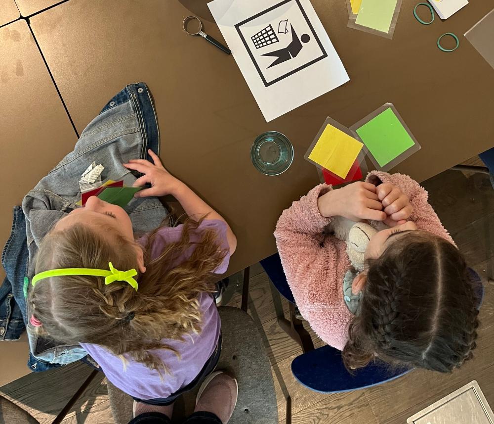 Annelies Appelhof en Laura Minderhoud ontvingen een groep kinderen in de Nautilus Expobar in Amsterdam. Er staan 3 tafels klaar; eentje ligt...